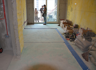 使用配套高低管卡固定牢靠,间距规范;热熔点150-200mm 范围内必须设置固定点,长向水路固定点间距600mm;穿墙 位置必须使用钢制套管。