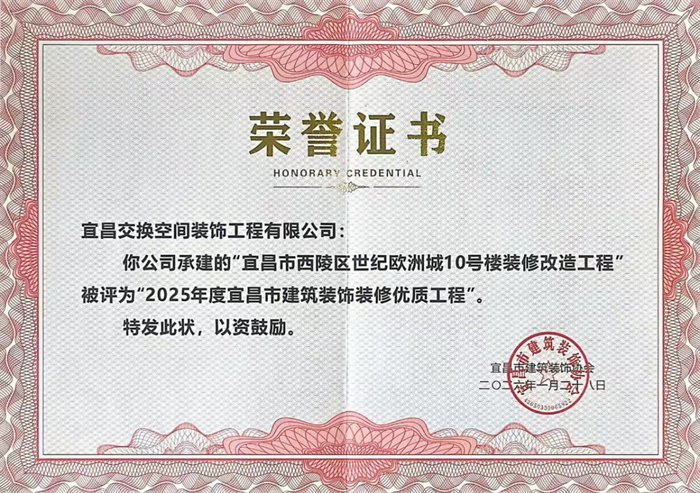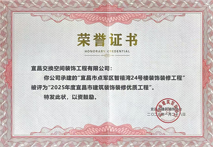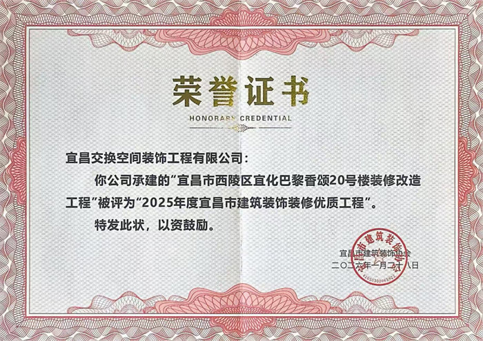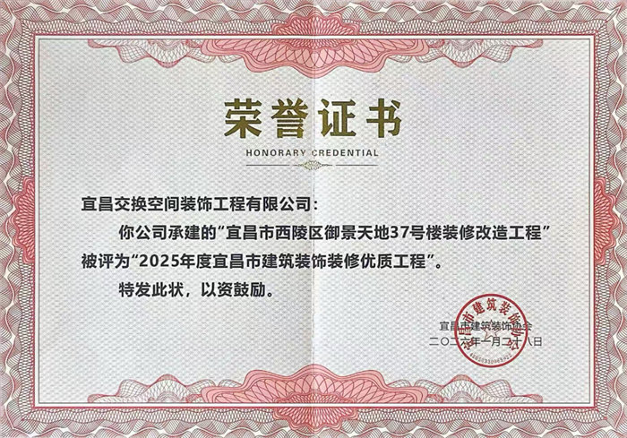 我司承建的5个项目,凭借扎实的施工质量、精湛的工艺水准及完美的落地效果,荣获“2025年度宜昌市建筑装饰装修优质工程”称号。