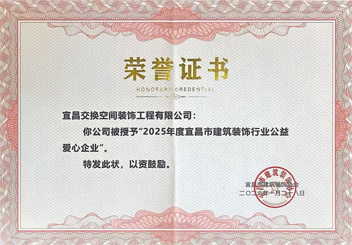 与此同时,交换空间装饰积极履行社会责任,投身公益事业,被授予“2025年度宜昌市建筑装饰行业公益爱心企业”荣誉称号。