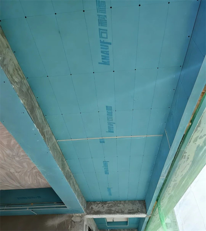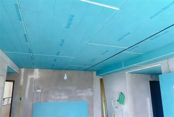 △吊顶平梁,梁下过一层石膏板,厚度10mm,缝隙用发泡胶软连接,所有石膏均要求切割平直,阳角不允许用石膏板原边,合格。