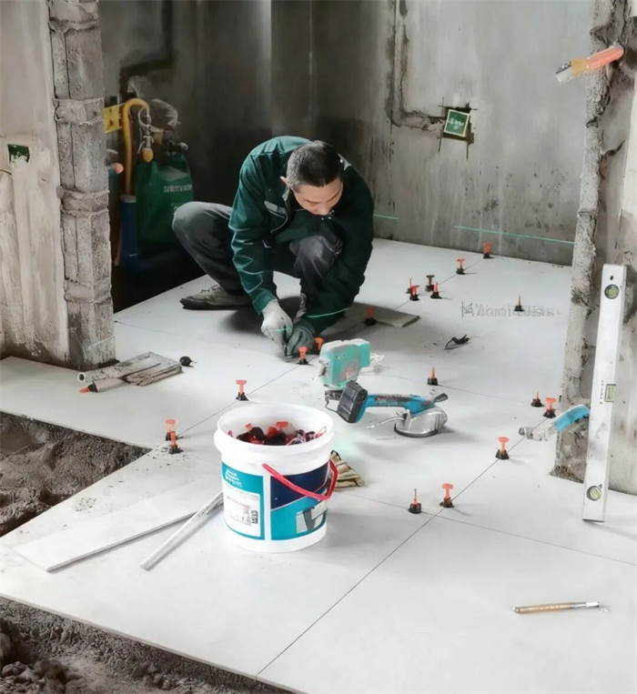 △这是我们的瓦工师傅正在用瓷砖调平器,这是为了每块砖与砖的平整度完全一致。