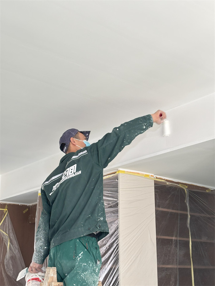 △工人师傅身着规范工服,正细致地进行墙面涂刷作业。从防护措施的周密布置,到涂刷动作的均匀细致,每一个步骤都体现着对工艺标准的坚守。