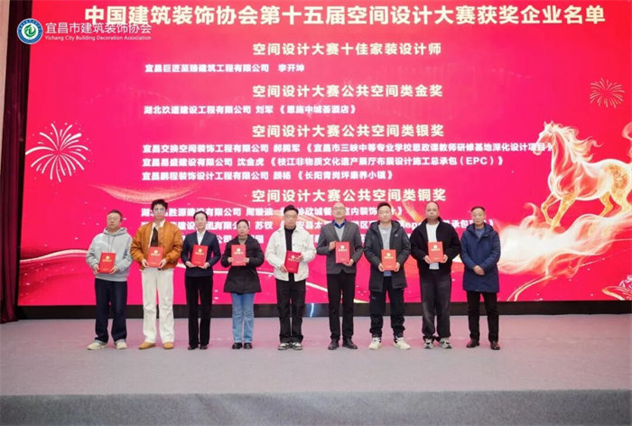 市委社工部部长、市委“两新”工委书记皮祖武向获得2025年度中国建筑装饰协会第十五届空间设计大赛奖项的企业,颁发获奖证书,祝贺他们夺得国家级奖项,激励市建筑装饰协会持续加强产业链党建工作,培育更多专业人才、行业精英、领军人物和精品工程、品牌服务,为持续推动宜昌市建筑装饰产业发展,提供政治保证和组织保障。
