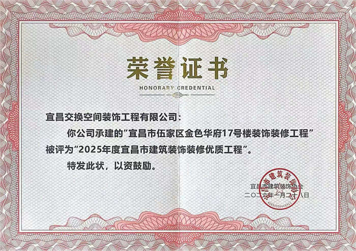 我司承建的5个项目,凭借扎实的施工质量、精湛的工艺水准及完美的落地效果,荣获“2025年度宜昌市建筑装饰装修优质工程”称号。